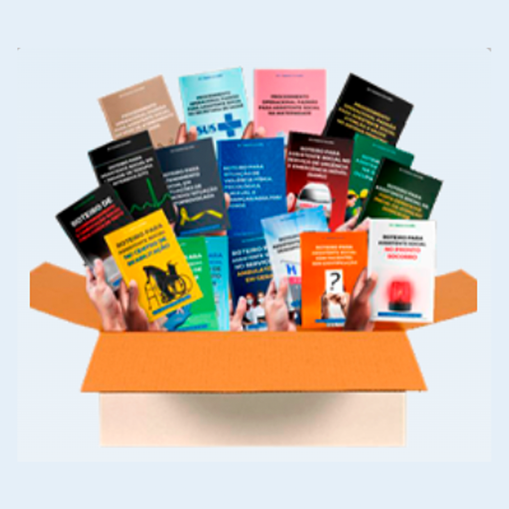 Incluídos materiais de leitura, além de modelos de entrevista, relatório social, evolução em prontuário, etc.